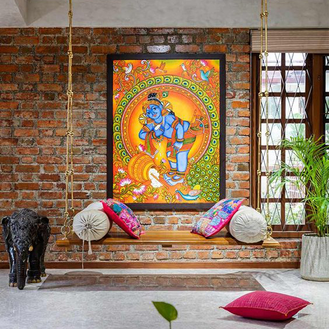 १०- दीवार को घेरता लोकशैली का आध्यात्मिक चित्र, हाथी और झूला