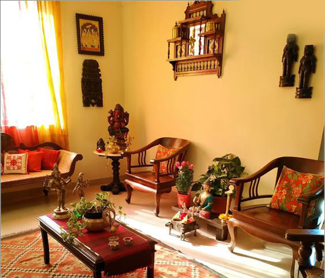११- पीतल के बर्तन, मूर्तियाँ, दीपक और पारंपरिक फर्नीचर के साथ दीवार पर काष्ठ कलाकृतियों का अद्भूत सामंजस्य