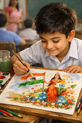 ही वह उस पर दिए गये विषय गणतंत्र-दिवस पर अपनी पेंसिल से