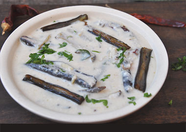 दही बैंगन को गरमागरम रोटी या चावल के साथ परोसें।