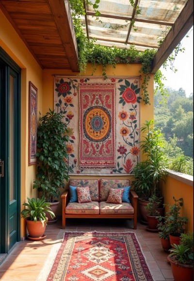 बोहेमियन गलीचे की परतें बालकनी में बैठने के लिए विश्राम