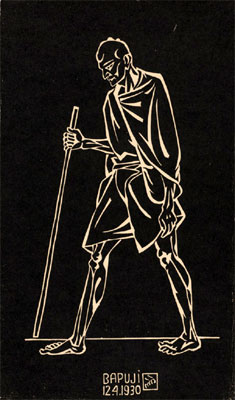 दौरान उन्होंने गाँधी जी के सफेद लिनोकट प्रिंट पर काली